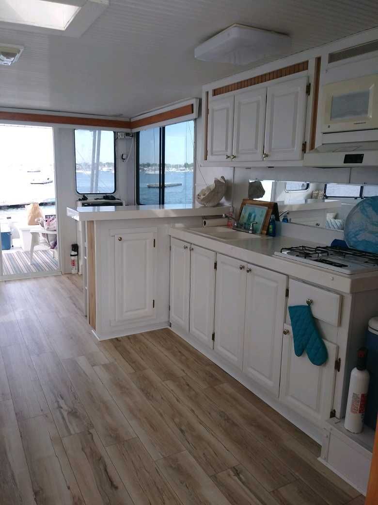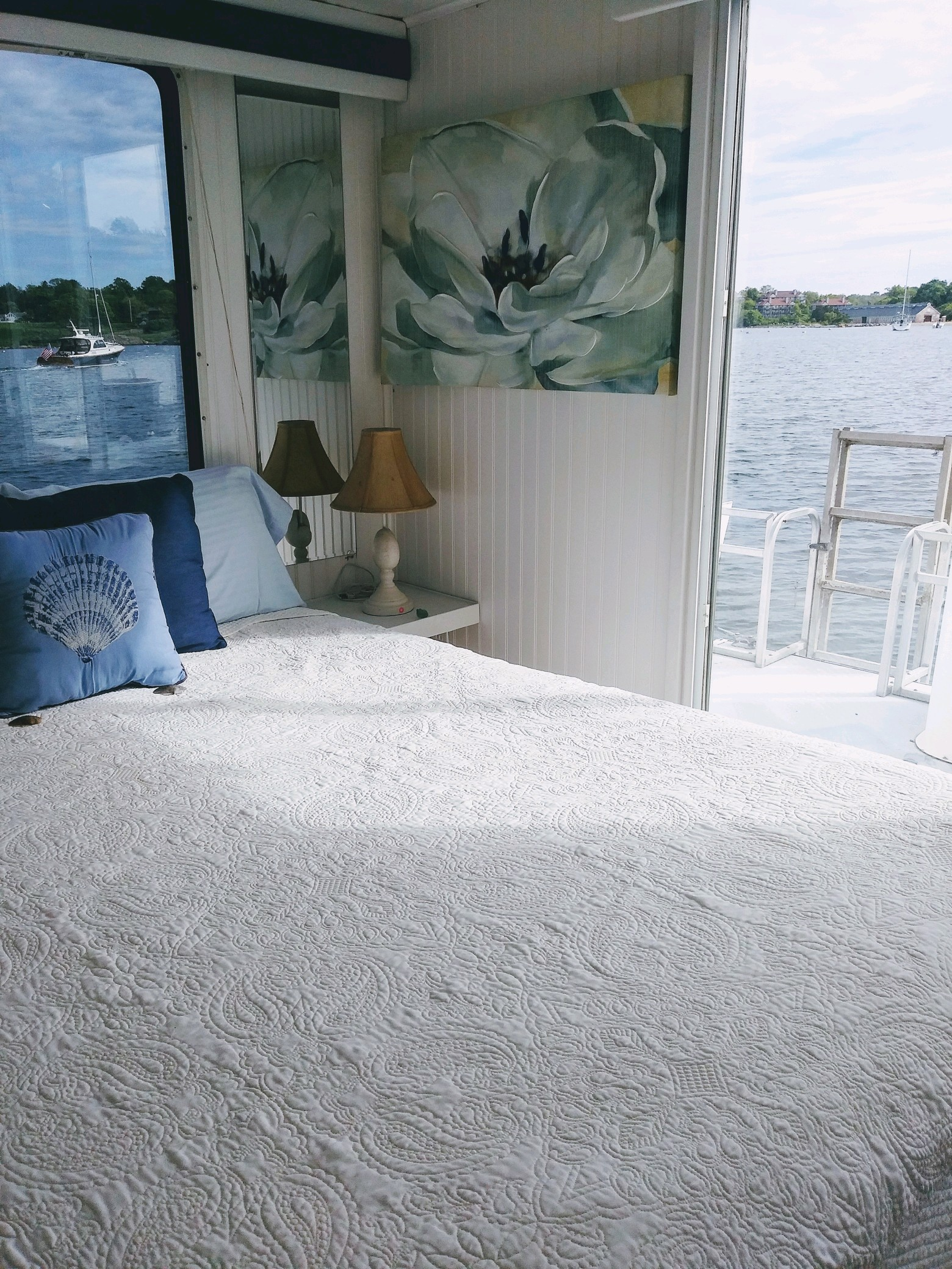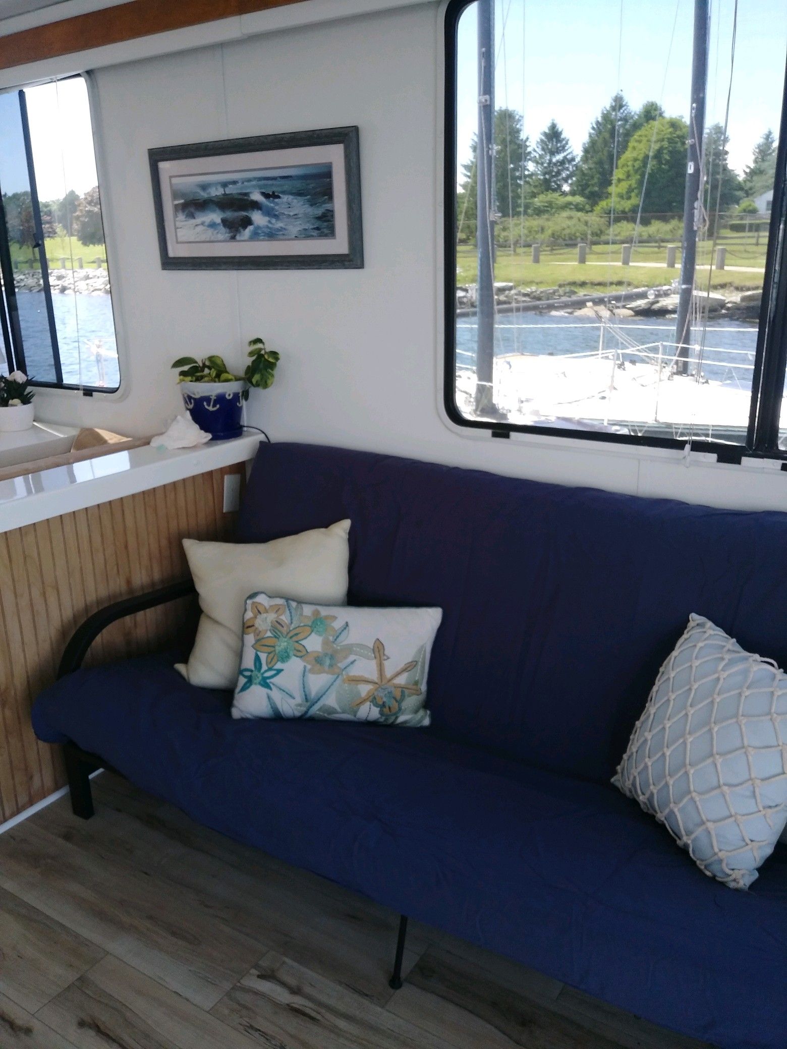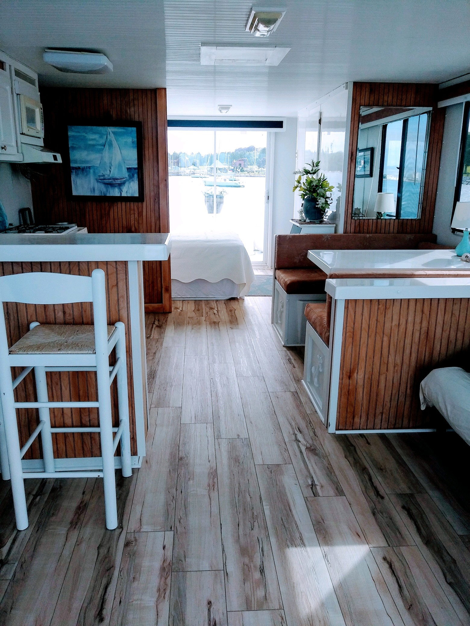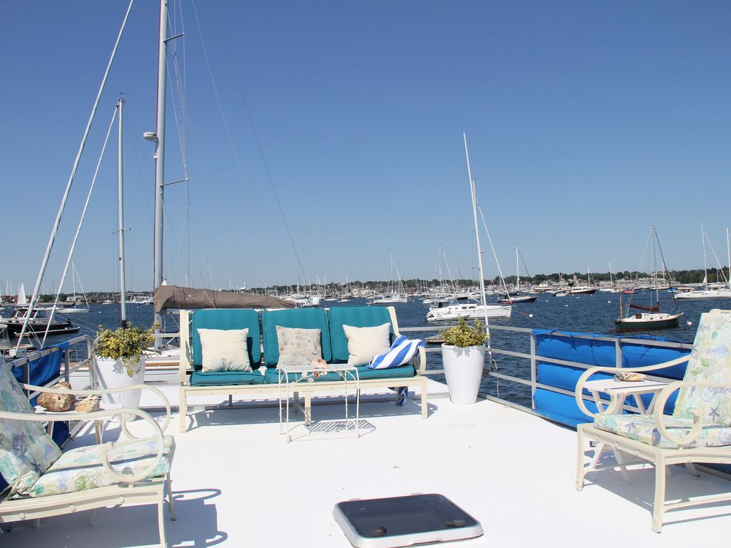 The Waterlily accommodates up to four people for overnight stays. There is an open floor plan which is bright and spacious! With plenty of large windows there is a panoramic view of the harbor and sea breezes. There are four decks on board. The deck on the bow has a cover over it which provides shade. There is a back deck with a ladder to swim off of. And the spacious upper deck furnished with comfortable couch chairs and lounge chairs.